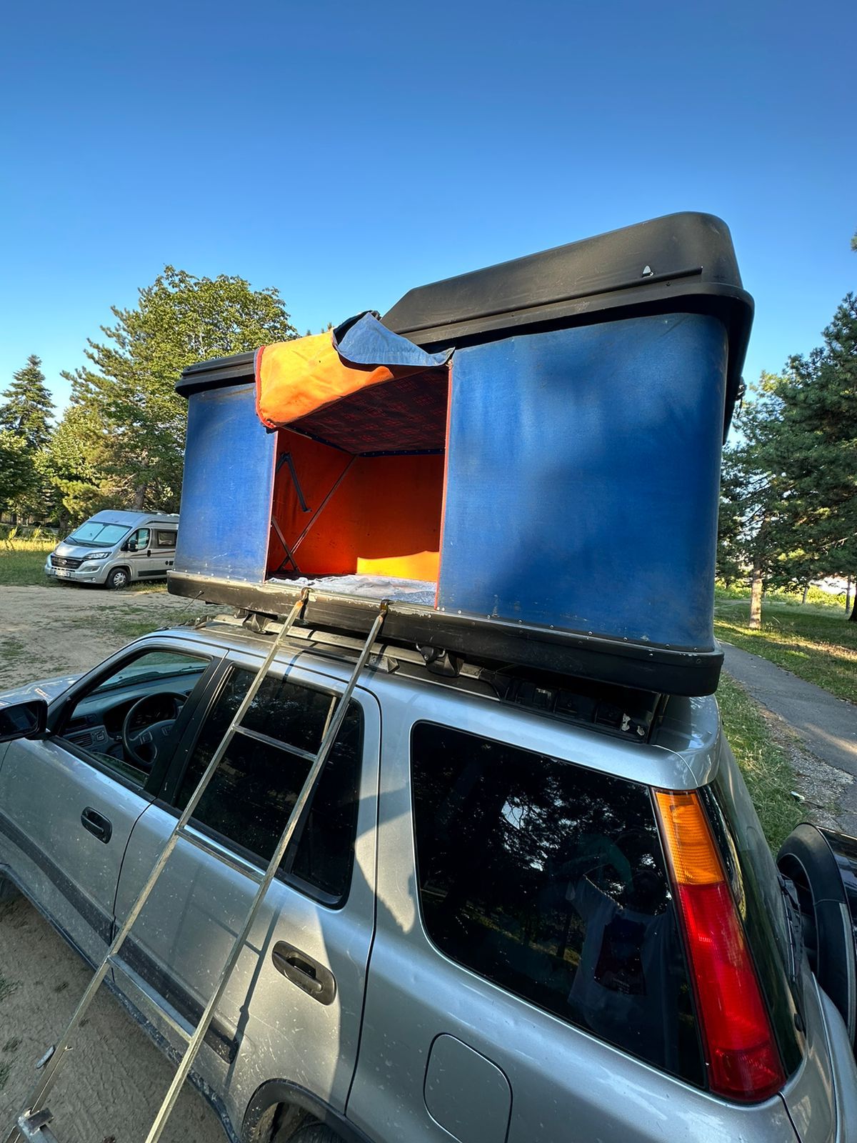 And at night you sleep quietly and comfortably in the practical roof tent.